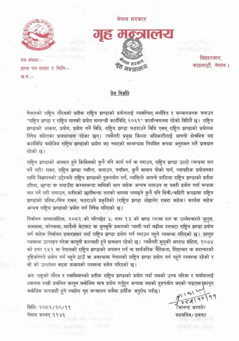 मन्त्रालयले आइतबार जारी गरेको विज्ञप्तिमा निर्वाचन आचारसंहिता विपरीत झण्डाको प्रयोग भए कानुन बमोजिम कारबाही हुने चेतावनी दिएको छ। मन्त्रालयका प्रवक्ता सहसचिव आनन्द काफ्लेले ‘निर्वाचन आचारसंहिता, २०८२’ को प्रावधानलाई कडाइका साथ पालना गर्न आग्रह गरेका छन्।