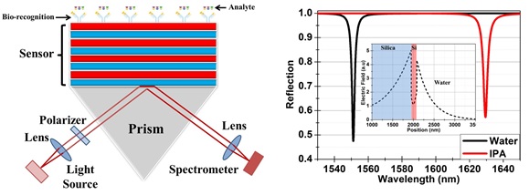 In the figure at left, Sketch of a BSW-based sensor. A bio-recognition layer is attached to the surface to make the sensor selective. Only the desired analytes can attach to the recognition layer resulting in a change in refractive index (n) above the surface. The sensor surface can be separated into arrays of different bio-recognition analytes in order to obtain a multichannel response. [right] Calculated wavelength-dependent reflection in water (n=1.33) and IPA (n=1.37) environments. The inset shows the calculated electric field of fundamental TM mode using a 133 nm-thick silicon layer at an angle of 26.1° with water as the overlying medium.